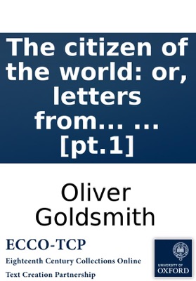 The citizen of the world: or, letters from a Chinese philosopher, residing in London, to his friends in the east. ... [pt.1], Oliver Goldsmith. The citizen of the world: or, letters from a Chinese philosopher, residing in London, to his friends in the east. ... Goldsmith, Oliver, 1730?-1774. 2v. ; 12⁰. Dublin : printed for George and Alex. Ewing, 1762. Anonymous. By Oliver Goldsmith. Reproduction of original from the Harvard University Houghton Library. English Short Title Catalog, ESTCN2062. Electronic data. Farmington Hills, Mich. : Thomson Gale, 2003. Page image (PNG). Digitized image of the microfilm version produced in Woodbridge, CT by Research Publications, 1982-2002 (later known as Primary Source Microfilm, an imprint of the Gale Group).