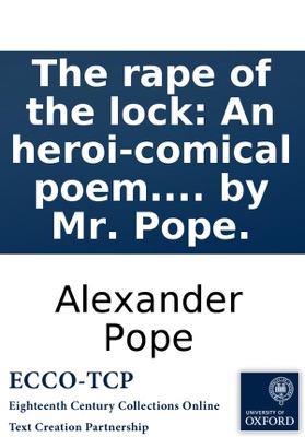 The rape of the lock: An heroi-comical poem. In five canto's. Written by Mr. Pope., Alexander Pope. The rape of the lock: An heroi-comical poem. In five canto's. Written by Mr. Pope. Pope, Alexander, 1688-1744. [8],48p.,plates ; 8⁰. London : printed for Bernard Lintott, 1714. Titlepage in red and black. First published in 'Miscellaneous poems and translations', 1712, in two cantos. Catchword p. 8: The. Reproduction of original from the British Library. Foxon, P941 Griffith, 29 English Short Title Catalog, ESTCT5726. Electronic data. Farmington Hills, Mich. : Thomson Gale, 2003. Page image (PNG). Digitized image of the microfilm version produced in Woodbridge, CT by Research Publications, 1982-2002 (later known as Primary Source Microfilm, an imprint of the Gale Group).