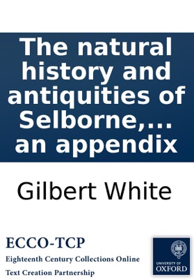The natural history and antiquities of Selborne, in the county of Southampton: with engravings, and an appendix, Gilbert White. The natural history and antiquities of Selborne, in the county of Southampton: with engravings, and an appendix White, Gilbert, 1720-1793. v,[3],468,[i.e. 466],[14]p.,plates ; 4⁰. London : printed by T. Bensley; for B. White and Son, 1789. Advertisement signed and dated: Gil. White. January 1st, 1788. With an index and list of errata. Sig. Ppp 2 misnumbered Pp2. The appendices are in Latin. The natural history and The antiquities each have their own half-title. P.292 misnumbered 262. Pp 441-2 are missed out of the pagination sequence but the text is continuous. With an additional titlepage, engraved. Reproduction of original from the British Library. English Short Title Catalog, ESTCT39642. Electronic data. Farmington Hills, Mich. : Thomson Gale, 2003. Page image (PNG). Digitized image of the microfilm version produced in Woodbridge, CT by Research Publications, 1982-2002 (later known as Primary Source Microfilm, an imprint of the Gale Group).