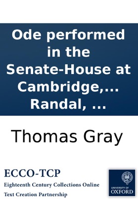 Ode performed in the Senate-House at Cambridge, July 1, 1769: installation of His Grace Augustus-Henry Fitzroy, Duke of Grafton, Chancellor of the University. Set to music by Dr. Randal, ..., Thomas Gray. Ode performed in the Senate-House at Cambridge, July 1, 1769: installation of His Grace Augustus-Henry Fitzroy, Duke of Grafton, Chancellor of the University. Set to music by Dr. Randal, ... Gray, Thomas, 1716-1771. The second edition. 8p. ; 4⁰. Cambridge : printed by J. Archdeacon. For T. & J. Merrill, Cambridge; J. Dodsley, J. Johnson & Co. and B. White, London, 1769. Anonymous. By Thomas Gray. Reproduction of original from the British Library. English Short Title Catalog, ESTCT41970. Electronic data. Farmington Hills, Mich. : Thomson Gale, 2003. Page image (PNG). Digitized image of the microfilm version produced in Woodbridge, CT by Research Publications, 1982-2002 (later known as Primary Source Microfilm, an imprint of the Gale Group).
