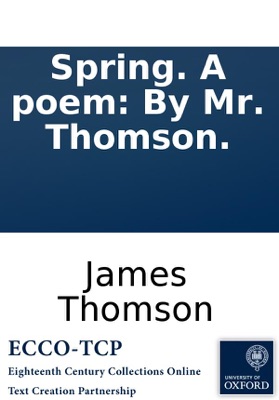 Spring. A poem: By Mr. Thomson., James Thomson. Spring. A poem: By Mr. Thomson. Thomson, James, 1700-1748. [12],57,[3]p. ; 8⁰. London : printed: and sold by A. Millar; and G. Strahan, 1728. With a half-title. Titlepage in red and black. The final leaf is: 'Proposals for printing by subscription The four seasons'. "Some copies add two leaves advertising Millar's books" (Foxon). A variant has no price at the foot of the titlepage. Reproduction of original from the British Library. Foxon, T227 English Short Title Catalog, ESTCT42751. Electronic data. Farmington Hills, Mich. : Thomson Gale, 2003. Page image (PNG). Digitized image of the microfilm version produced in Woodbridge, CT by Research Publications, 1982-2002 (later known as Primary Source Microfilm, an imprint of the Gale Group).