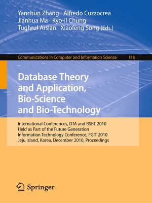 Welcome to the proceedings of the 2010 International Conferences on Database Theory and Application (DTA 2010), and Bio-Science and Bio-Technology (BSBT 2010) – two of the partnering events of the Second International Mega- Conference on Future Generation Information Technology (FGIT 2010). DTA and BSBT bring together researchers from academia and industry as well as practitioners to share ideas, problems and solutions relating to the multifaceted aspects of databases, data mining and biomedicine, including their links to computational sciences, mathematics and information technology. In total, 1,630 papers were submitted to FGIT 2010 from 30 countries, which includes 175 papers submitted to DTA/BSBT 2010. The submitted papers went through a rigorous reviewing process: 395 of the 1,630 papers were accepted for FGIT 2010, while 40 papers were accepted for DTA/BSBT 2010. Of the 40 papers 6 were selected for the special FGIT 2010 volume published by Springer in the LNCS series. 31 papers are published in this volume, and 3 papers were withdrawn due to technical reasons. We would like to acknowledge the great effort of the DTA/BSBT 2010 International Advisory Boards and members of the International Program Committees, as well as all the organizations and individuals who supported the idea of publishing this volume of proceedings, including SERSC and Springer. Also, the success of these two conferences would not have been possible without the huge support from our sponsors and the work of the Chairs and Organizing Committee.